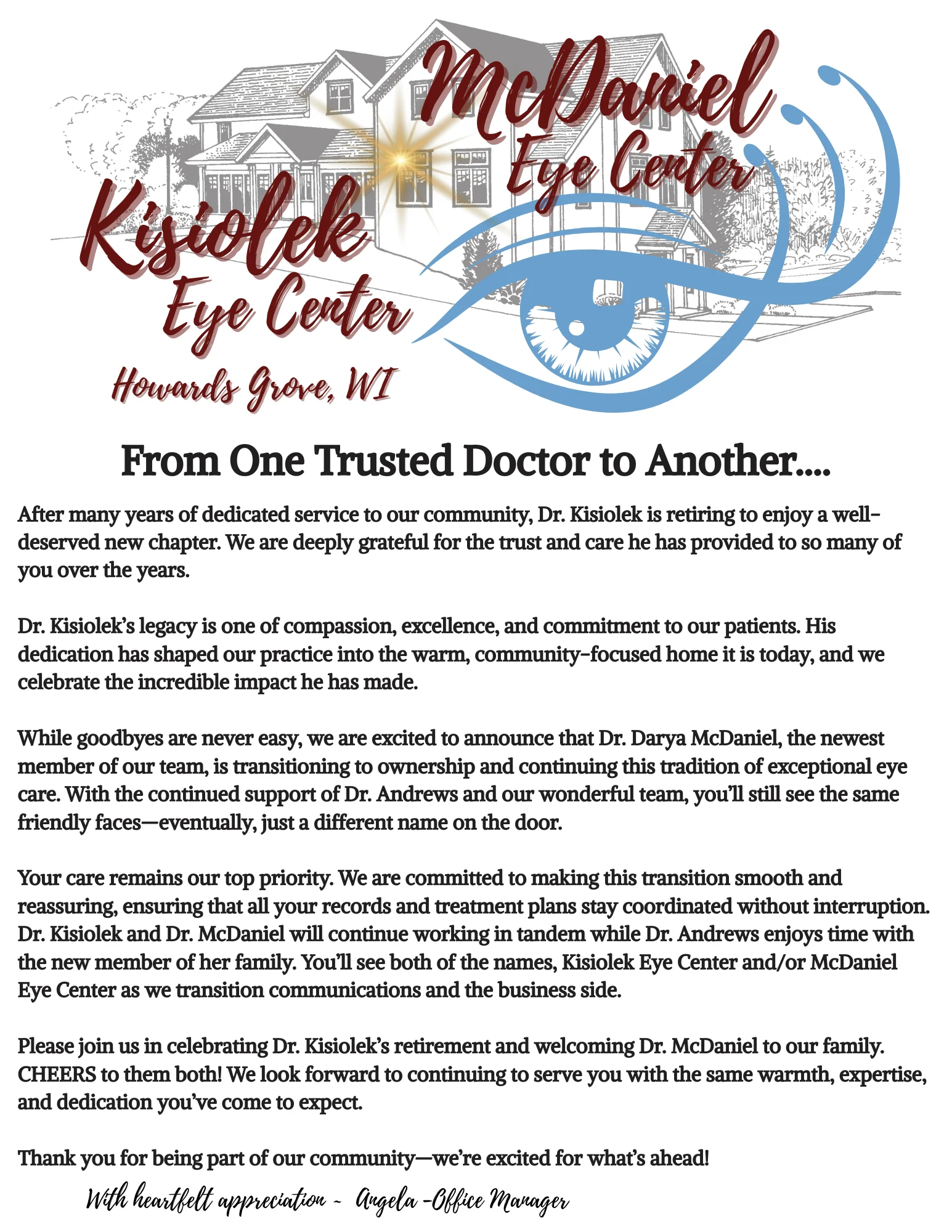 We are an independent optometric practice located in Howards Grove, WI. For over thirty years the growth and success of Kisiolek Eye Center has been founded on a commitment to providing the latest in eye care technology as well as a never ending quest for excellence in patient satisfaction.